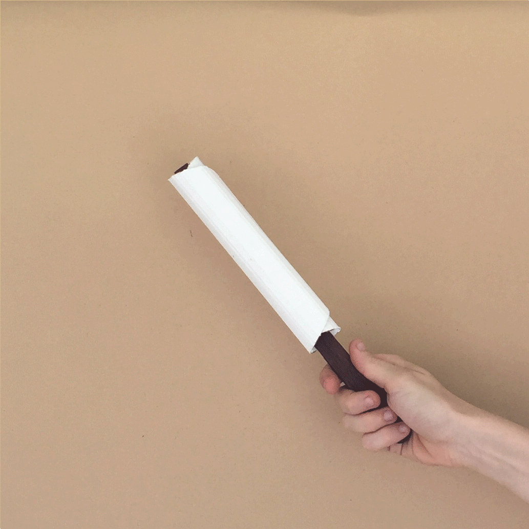 To open the fan, set the wooden handle in a vertical position to the ribs, to create a sound structure that keeps the fan from rolling back.